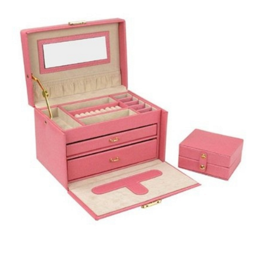 One of our favorites is our pink jewelry box. It comes with pull out trays and a travel case (shown to the right). It's perfect for storing rings, earrings, necklaces, pendants - pretty much everything. And it comes with a mirror!